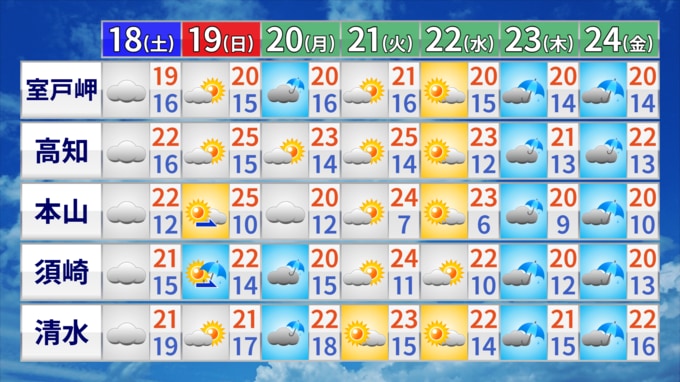 19日は日差しが届き夏日となる地点もあるでしょう。行楽日和となる反面、水分補給も忘れずに行ってください。20日(月)は朝にわか雨のところがある見込みです。