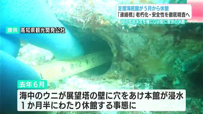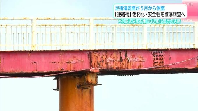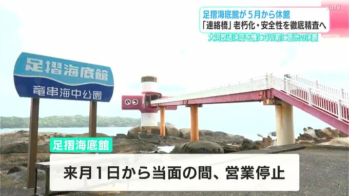その後、穴は修繕され営業が続けられていましたが、県観光開発公社によりますと、現在は岸から施設へと続く「連絡橋」の老朽化が進行しているということです。このため、職員が目視で点検するなど安全確認をしながら営業されていますが、4月9日、土佐清水市出身のジョン万次郎が主人公の大河ドラマが2028年1月から放送されることが決まり、大勢の観光客が施設に訪れるのを前に「一時休館」を決めたということです。