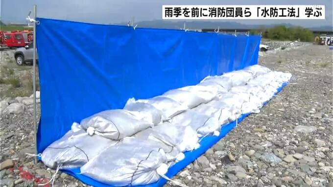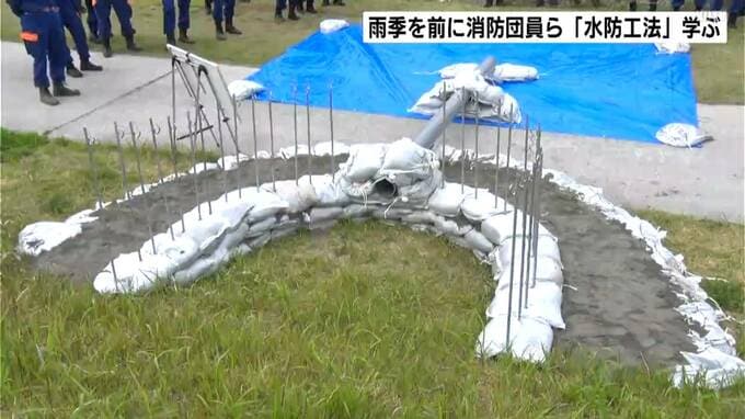 また、参加者は用途に応じた水防工法を教わりました。水漏れ対策としては『月の輪工』。土のうを積み上げ、寝かせた太い管を通して溜まった雨水の水圧を弱めて放流します。