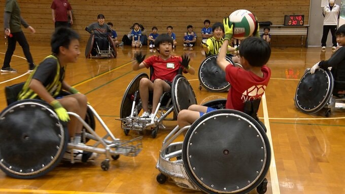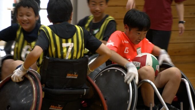 まず、子どもたちが体験したのは、年齢や性別、国籍や障がいの有無に関わらず楽しめる、「ユニバーサルラグビー」。車いすラグビーでは、慣れない手の動きに苦戦しながらも声を掛け合い、みんなでゴールを目指します。
