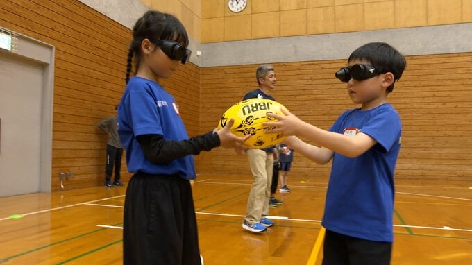こちらの子どもたちは見える範囲や見えづらさが異なるゴーグルをつけて、「ブラインドラグビー」を体験。