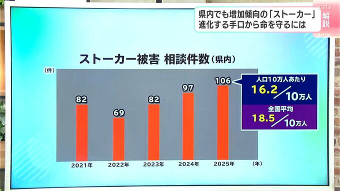 高知県内のストーカー被害の相談件数は去年106件で、過去5年間で最も多い数字となりました。人口10万人あたりでみると高知はおよそ16.2人。全国平均よりは少ないですが、増加傾向です。(全国平均18.5人)