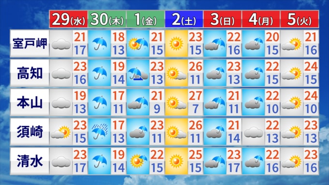 29日の高知県内は、気圧の谷や湿った空気の影響で雲が広がる一日となりそうです。夜遅くには西部を中心に雨の降り始めるところがあるでしょう。気温は平年並みかやや高く、過ごしやすい一日となりそうです。