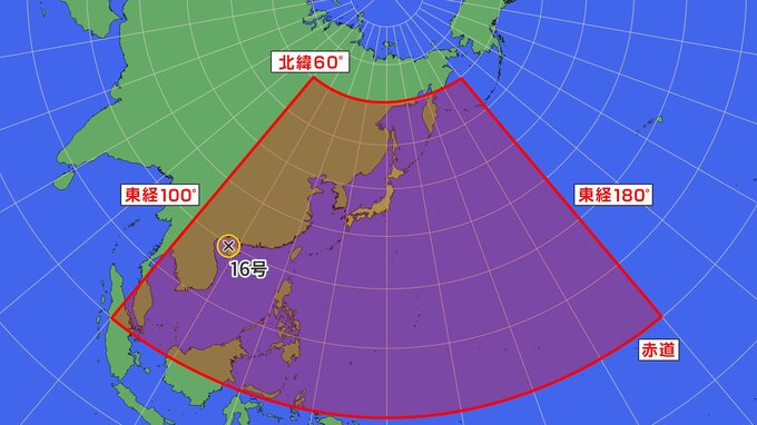 日本の気象庁が台風の予報を行う範囲も決まっており、南北は赤道以北から北緯60度まで、東西は東経100度から180度までの範囲にある台風の位置決定、および予報を担当しています。