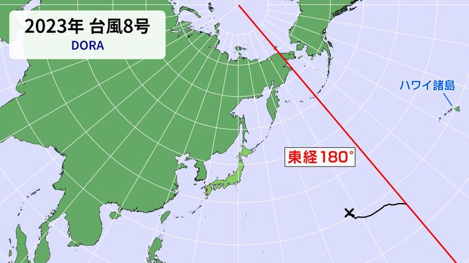 2023年の8月中旬に“台風”となった8号が基準となる経線を越えて名前が変わった台風の例です。この台風8号はもともとハリケーンで(ハワイで起きた大規模な山火事の延焼原因となった)日付変更線を超えて台風8号となりました。