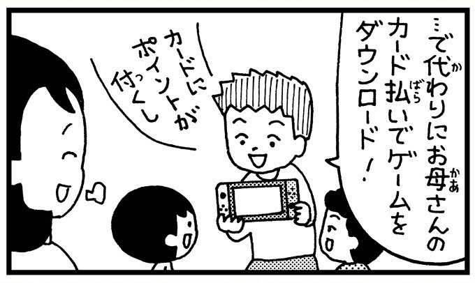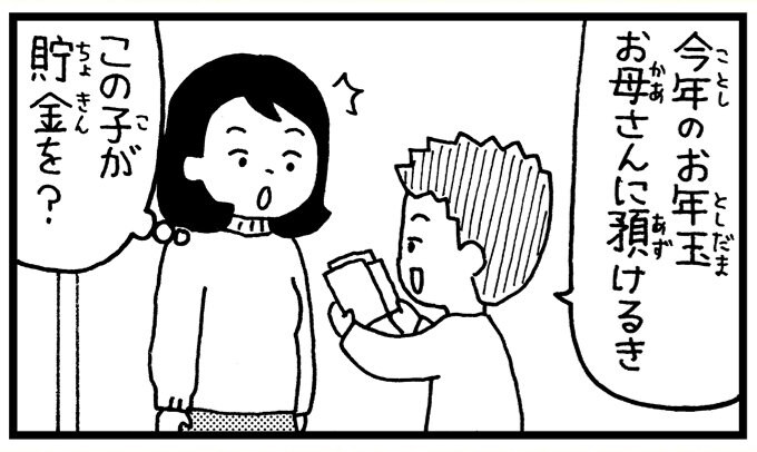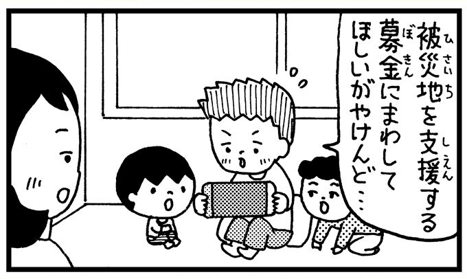 男の子が、もらったお年玉の一部を被災地支援にまわしてほしいと願う4コマ。「寄付を促すというものではなく、あくまでも、それぞれの立場で何ができるか考えるきっかけにしてほしい」という村岡さん。被災地に寄り添うことはもちろん、高知の読者に寄り添う事も大切にしています。