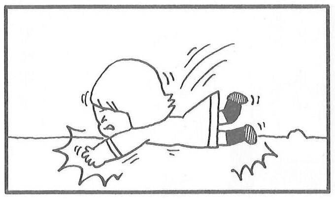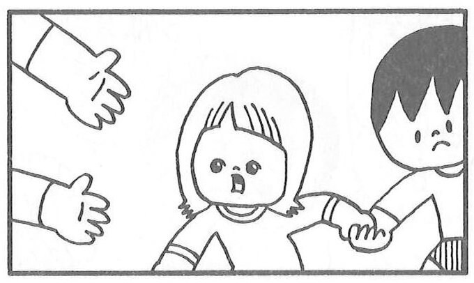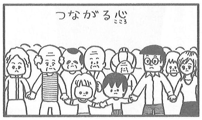 2011年3月12日、発生翌日の新聞では、転んだ女の子に、手を差し伸べる男の子が…セリフは一切なく、結びの4コマ目には、老若男女が手をつなぎ、「つながる心」の文字。