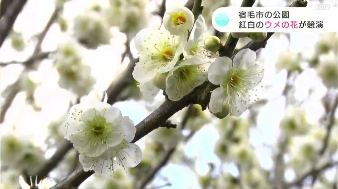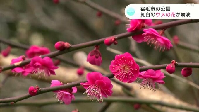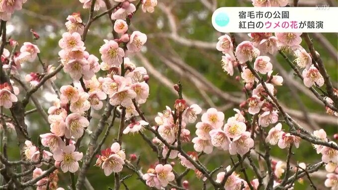 紅白が揃った状態の花の見ごろは今月中旬までで、白や桃色のウメの花は下旬までみられそうです。