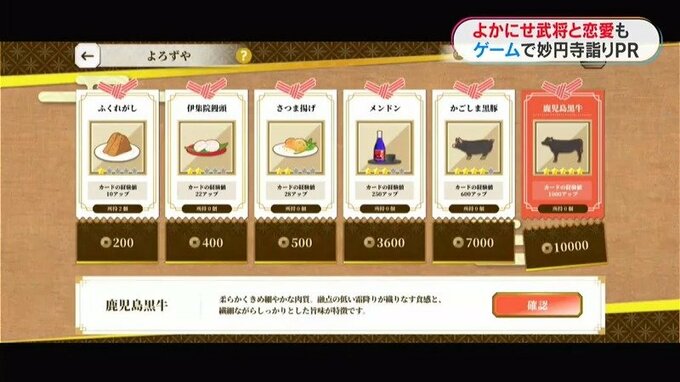 キャラクターをレベルアップさせるアイテムも「ふくれがし」や「さつま揚げ」など、鹿児島ならでは。ゲーム中に気になった特産品は、実際に買うこともできます。