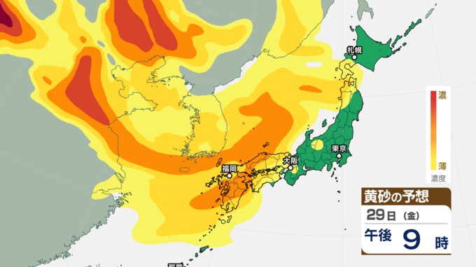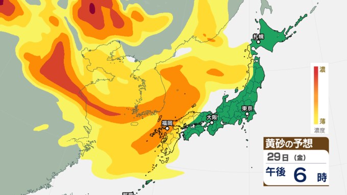 黄砂が飛来する場所や濃さを予想したシミュレーション画像では、29日(金)夕方から夜にかけて九州北部の福岡に「濃いオレンジ色」がかかる時間帯があります。30日にかけて鹿児島、宮崎、四国、近畿、関東の一部にも濃いオレンジがかかる時間帯があります。