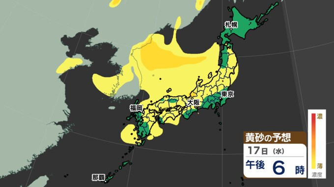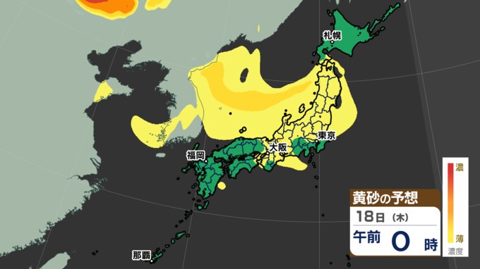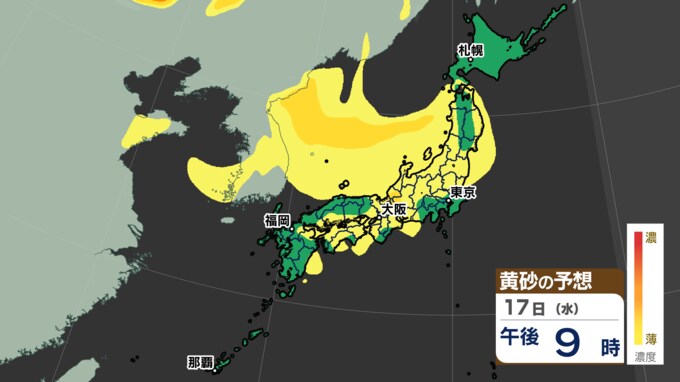 18日にかけて、北日本から西日本の広い範囲で黄砂が予想