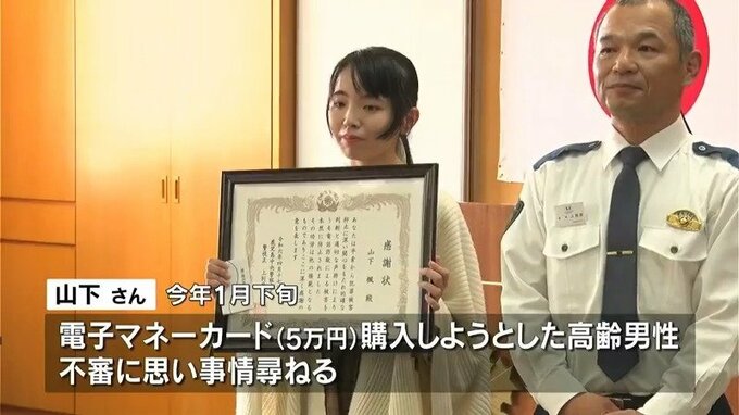山下さんは、今年1月下旬、高齢の男性が5万円分の電子マネーカードを購入しようとした際、購入金額が高額だったことから、事情を尋ねました。