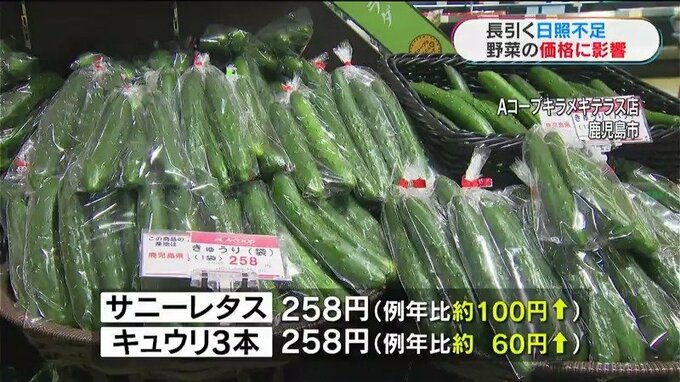 こちらのスーパーでは、サニーレタスが例年より100円ほど高い258円、キュウリも3本で258円など、野菜は全体的に例年より2~3割高くなっています。