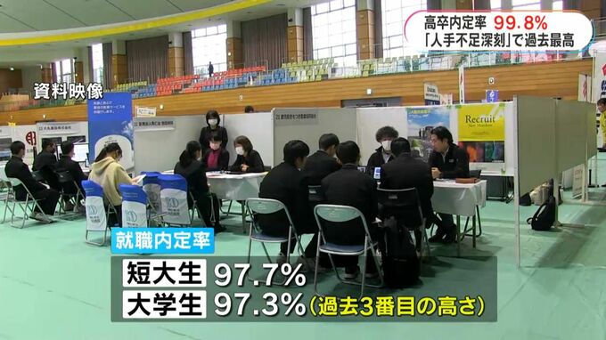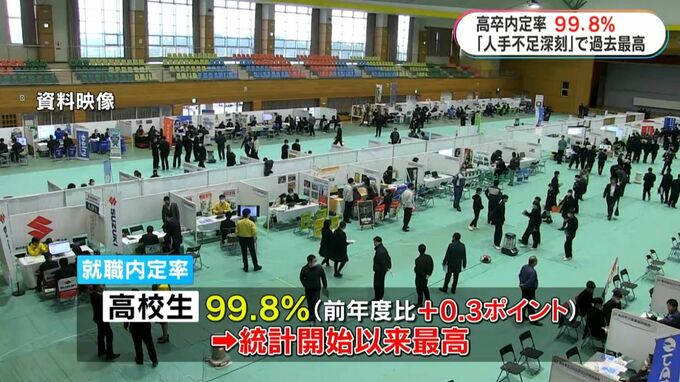 これによりますと、高校生の就職内定率は、前の年より0.3ポイント高い99.8パーセントで、統計開始以来、最高となりました。背景について鹿児島労働局は「人手不足が深刻化し、採用活動が高まった結果」としています。