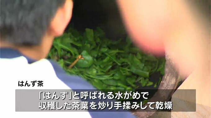 はんず茶は江戸時代に中国から鹿児島市の松元地区や日置市に伝った釜炒り茶の製法の一つで、収穫した茶葉を「はんず」と呼ばれる水がめで炒り、手揉みして乾燥させ、およそ3時間かけてつくられます。