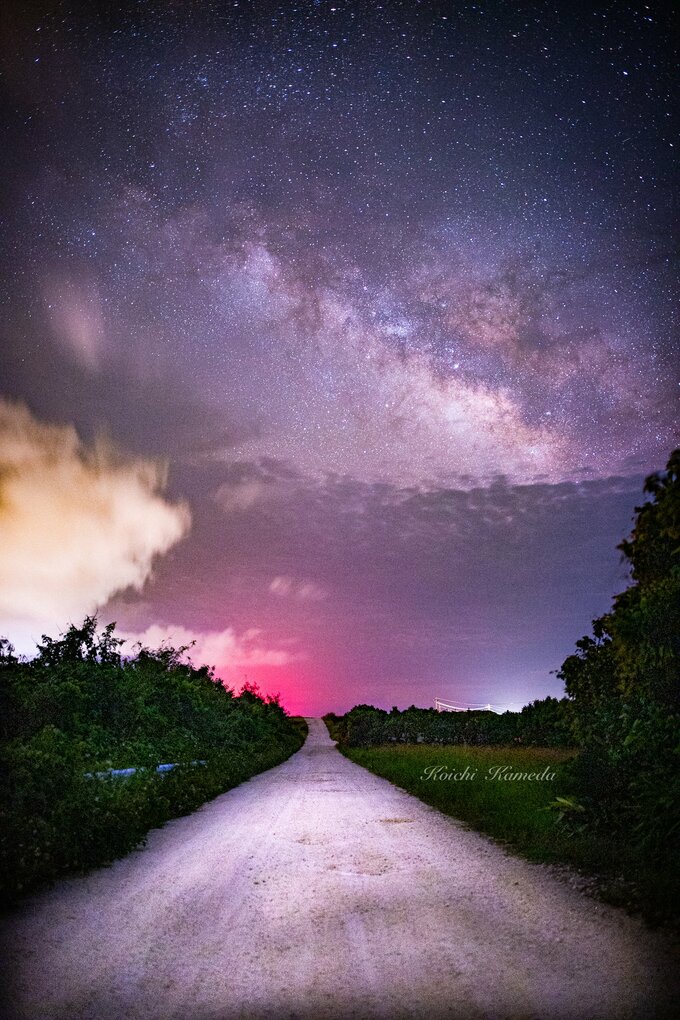 与論島には「コーラルウェイ」、サンゴの砂でできた白い道があります。別名「ホワイトロード」。長時間露光の写真では、畑の中にまっすぐな白い道が浮かび上がっているようです。