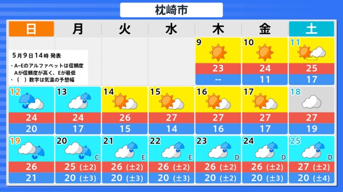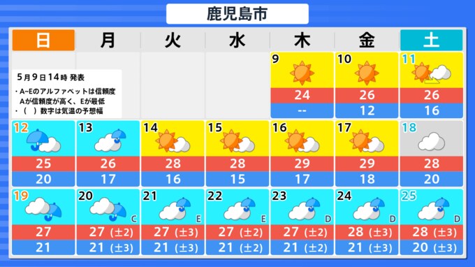 気象台によりますと、九州南部の向こう2週間の気温は、10日は寒気の影響で低いでものの、その後は暖かい空気が流れ込みやすくなる見込みです。気温が高い日が多くなり、15日ごろからはかなり高くなる可能性があります。