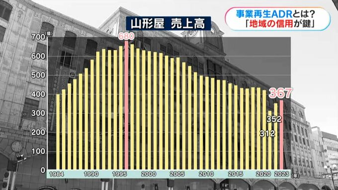 山形屋のここ40年間の売上高です。1996年のおよそ680億円をピークに減少傾向となり、2021年はコロナの影響で312億円に。しかし、2022年は352億円、翌23年は367億円と、2期連続増収と持ち直していました。