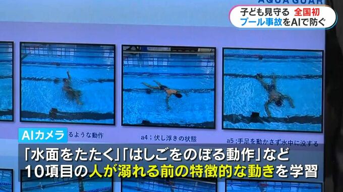 このAIカメラには「水面を叩く動作」や「はしごを上るような動作」「ビート板がひっくり返る」など、10項目の人が溺れる前の特徴的な動きを学習させてあり、子どもたちの動きをリアルタイムで解析します。