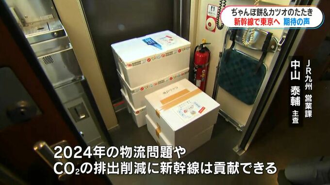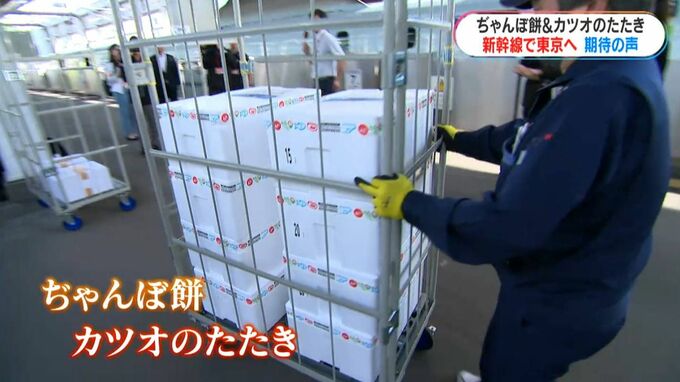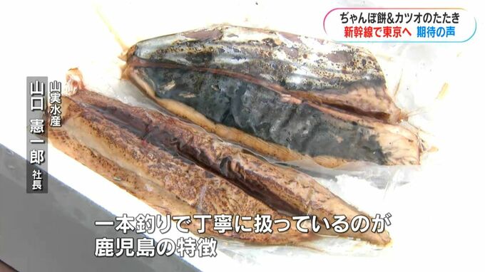 鹿児島の名産品ぢゃんぼ餅とカツオのたたきが、新幹線で東京へと送られました。つくり手からは、大消費地の東京で販売できることに喜びの声が聞かれました。