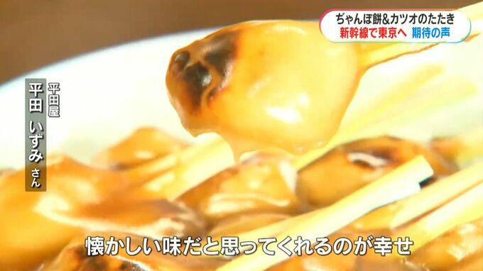 そして、鹿児島を出発して10時間後の午後5時すぎ、ぢゃんぼ餅とカツオのたたきが東京駅の会場に並びました。