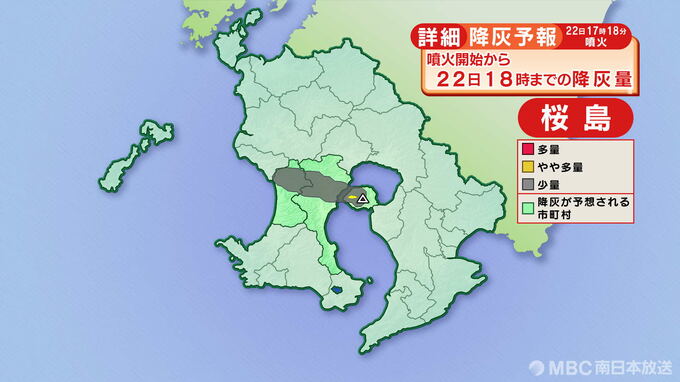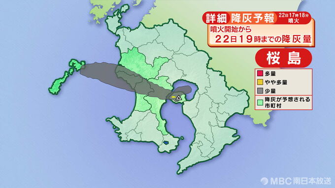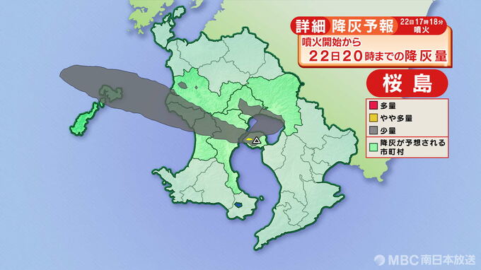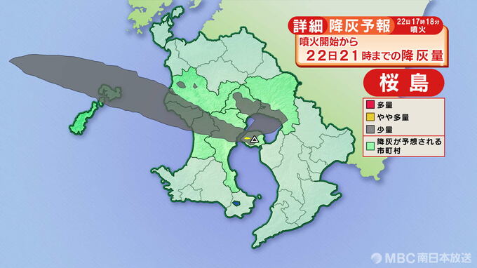 火口から北西方向(鹿児島市吉野方向)に火山灰が流され、22日23時までに鹿児島市(桜島)ではやや多量の降灰があり、降灰は鹿児島県薩摩川内市まで予想されます。