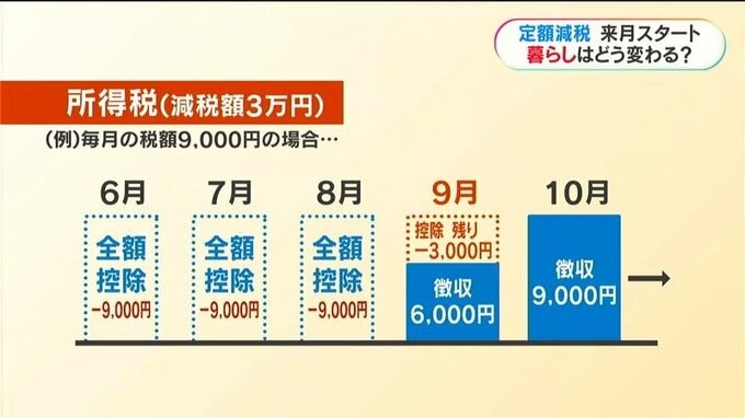というのも定額減税は、一度に全額が減税されるわけではありません。減税額が3万円の所得税なら、例えば、毎月の所得税が9000円の場合、6月から8月までは全額控除に。9月は残りの3000円だけ控除され、6000円を徴収されます。