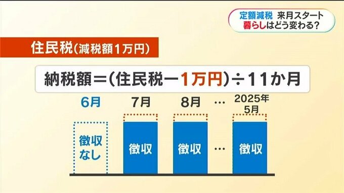 また、住民税は6月分は徴収されず、7月以降、11か月に分けて減税を反映した納税額を徴収されることになります。