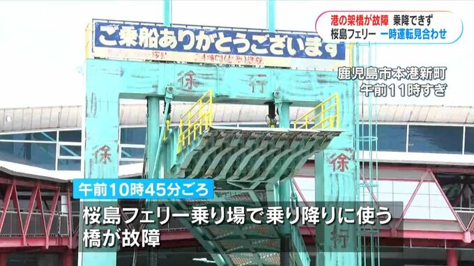 桜島フェリーが一時見合わせ 架橋が動かず「やきもき」 油圧配管トラブルか 鹿児島 2024年5月24日(金) 19:17 国内 24日午前、桜島フェリーの鹿児島港側の乗り場で人や車が乗り降りする架橋が動かなくなりました。この影響で、桜島フェリーはおよそ2時間に渡って運航を見合わせました。鹿児島市によりますと24日午前10時45分ごろ…