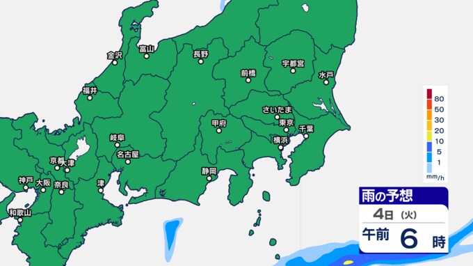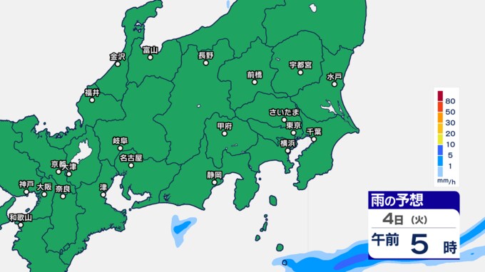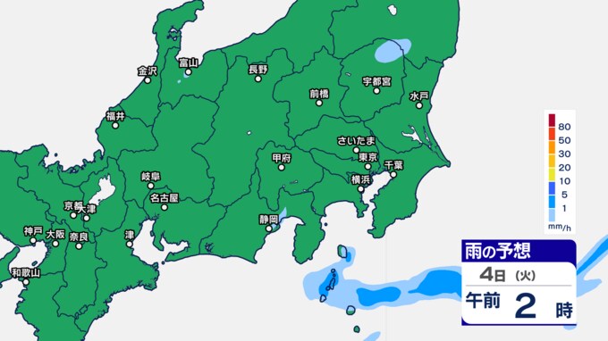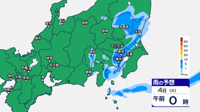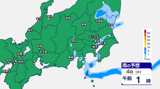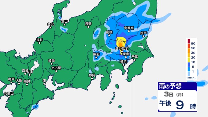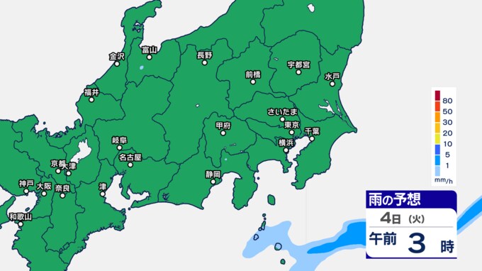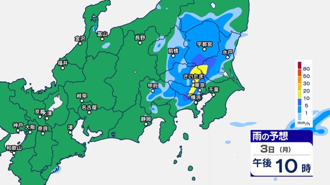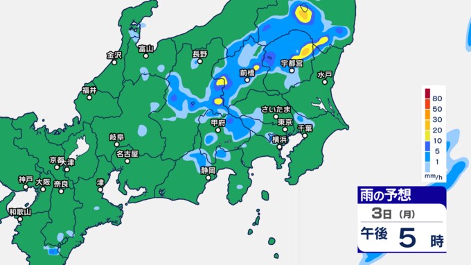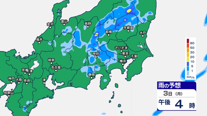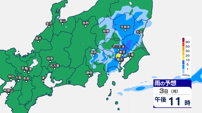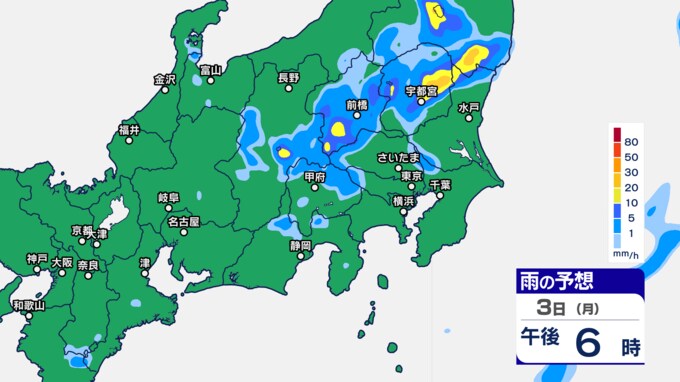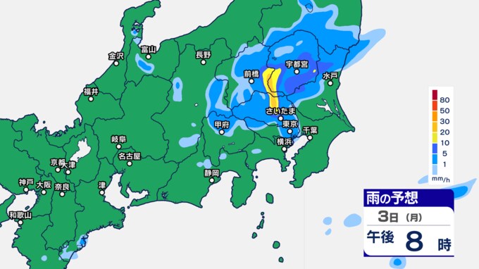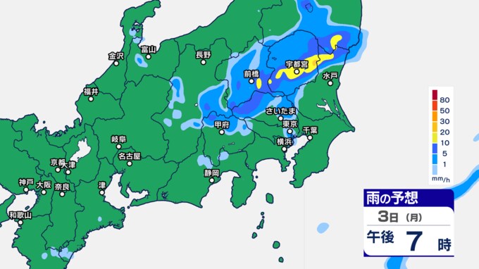 関東甲信の雨シミュレーションでは、3日午後7時ごろから11時ごろにかけて、東京都、群馬県、栃木、茨城県、埼玉県の一部に発達した雨雲がかかる予想です。