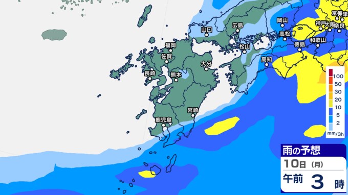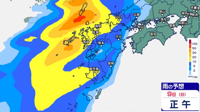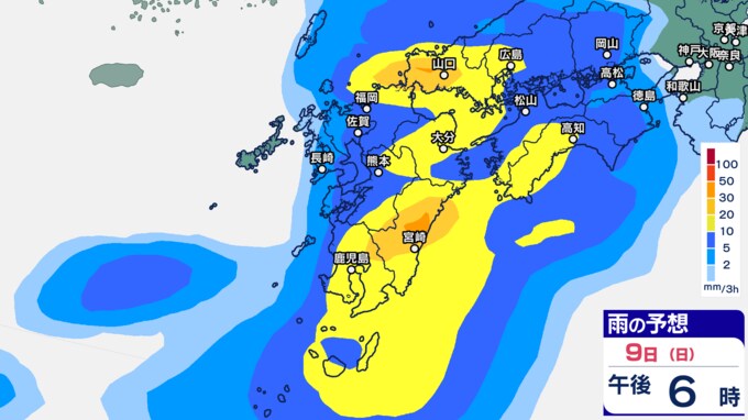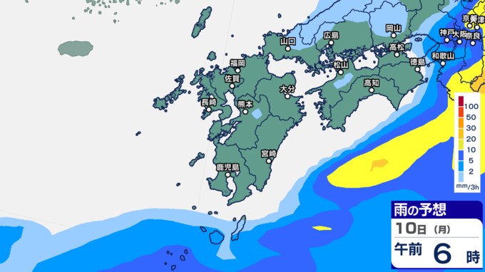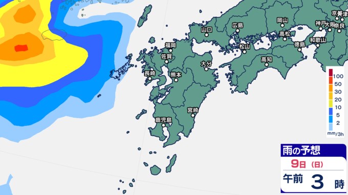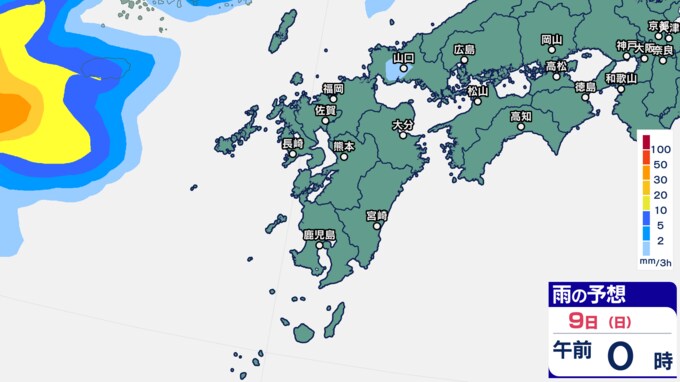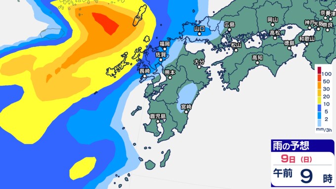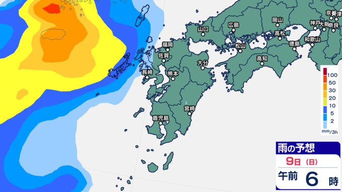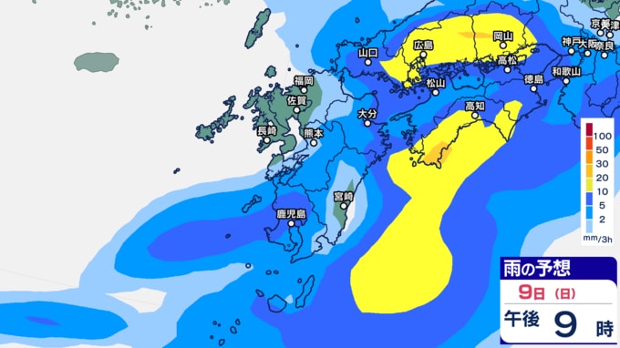 雨シミュレーションでは、9日午前6時ごろから九州の西の海上から発達した雨雲が流れ込み、九州北部と九州南部には午後9時ごろまで雨雲がかかる予想です。奄美地方や沖縄地方では、10日にかけて雨雲がかかります。9日(日)~10日(月)の雨シミュレーションは画像で掲載しています。