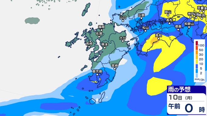 10日(月)には、雨の中心は東に進み、中国・四国地方から近畿、東海、関東などにかかる予想です。