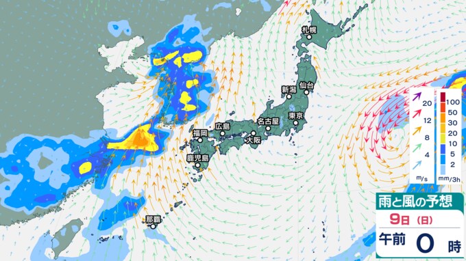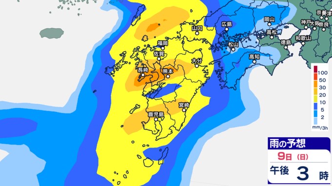 太平洋高気圧が梅雨前線を押し上げ、梅雨前線に向かって暖かく湿った空気が流れ込み、九州では9日(日)、ところによって大雨のおそれがあります。