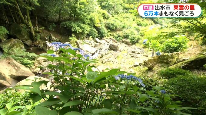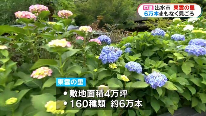 出水市上大川内の東雲の里です。こちらの園では4万坪ほどの広さに、160種類およそ6万本のアジサイが咲いています。現在7分咲きで、まもなく見ごろを迎えます。