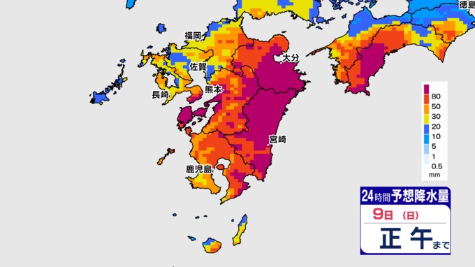 9日(日)正午までに予想される雨量は、多いところで次の通りです。