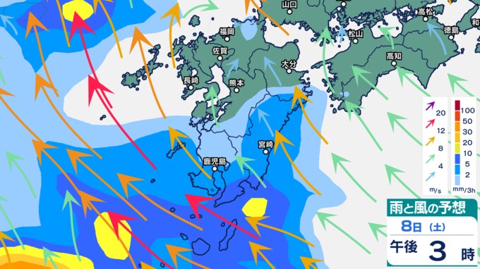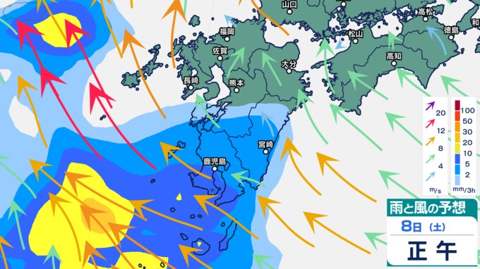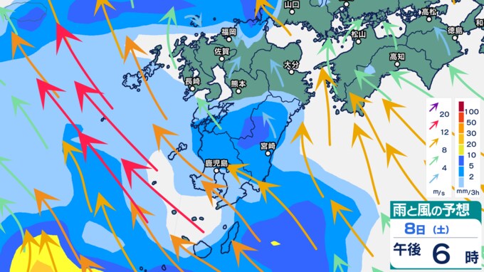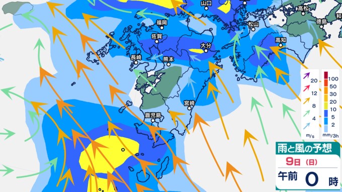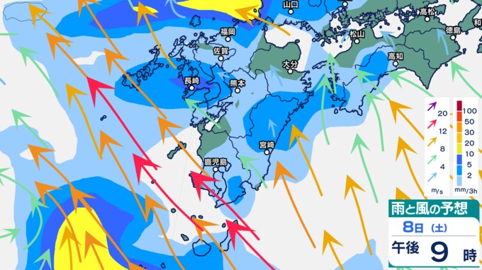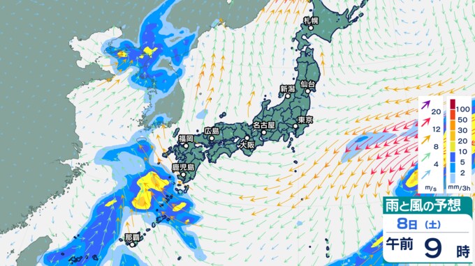 雨シミュレーションでは、8日(土)午前から九州の西の海上から発達した雨雲が流れ込み、九州南部から雨になる予想です。午後にかけて雨雲は九州北部にもかかる予想です。9日(日)は、九州の広い範囲に発達した雨雲がかかり、九州は大雨となるおそれがあります。雨のピークは9日とみられていますが、早まる可能性もあります。