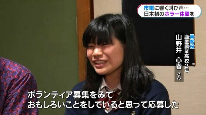 (乗客役・鹿屋農業高校2年 山野井心春さん)「ボランティア募集をみて、おもしろいことしていると思って応募した。ここに来て練習するのは、自分にとって楽しさの一部」