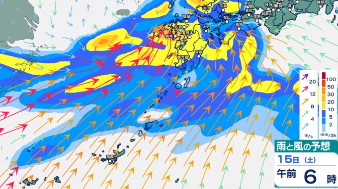 雨シミュレーションでは、九州では15日(土)午前から夜にかけて発達した雨雲がかかる予想です。九州の広い範囲で大雨のおそれがあります。