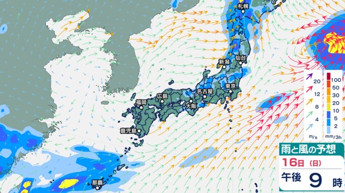 雨シミュレーションでは、土日の雨の中心は鹿児島や沖縄になりそうですが、本州の南に伸びる前線に、南から暖かく湿った空気が流れ込み、16日(日)には東海や関東の一部に雨雲がかかる時間帯があると予想されています。
