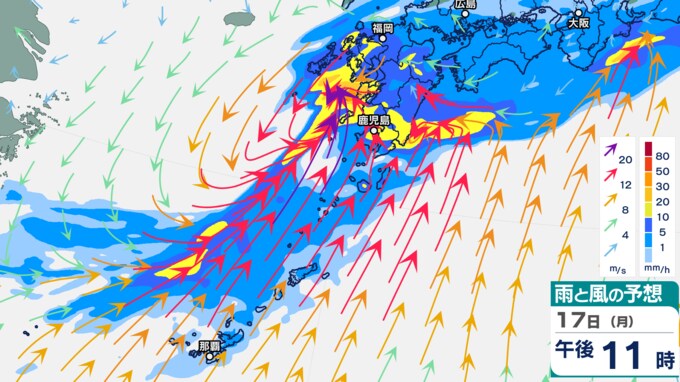 九州南部では17日夜から18日午前中にかけて、四国地方で18日午前中は、線状降水帯が発生して大雨災害発生の危険度が急激に高まる可能性があります。