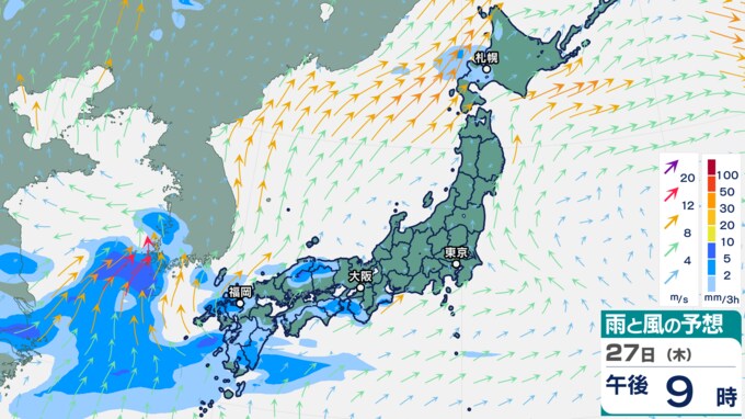 あさって28日(金)の雨シミュレーションでは、未明から昼過ぎにかけて、九州を中心に活発な雨雲がかかり続け、午後には中国地方に発達した雨雲がかかる予想です。近畿、東海、関東などにも局地的に強い雨雲がかかる時間がありそうです。