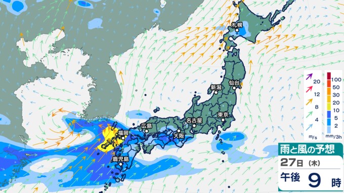 線状降水帯が発生するおそれがあるのは、九州北部地方(福岡県、佐賀県、長崎県、熊本県、大分県、山口県)で、27日夜から28日午前中にかけてです。