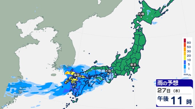 ▼九州北部地方(福岡県、佐賀県、長崎県、熊本県、大分県、山口県)では、27日夜から28日午前中にかけて、線状降水帯が発生し、大雨災害発生の危険度が急激に高まる可能性があります。土砂災害に厳重に警戒し、低い土地の浸水、河川の増水や氾濫に警戒してください。