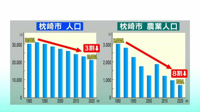 ただ、問題があります。1980年、3万人だった枕崎市の人口はその後の40年間で、2万1000人に減りました。一方、枕崎市で農業を営む人は3000人から700人まで減少しました。