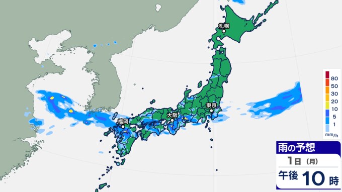 きょう・あすの雨シミュレーション(1時間ごと)では、九州、中国、近畿、東海、北陸などに局地的に発達した雨雲がかかる予想です。2日は未明から日中、夕方にかけて九州、中国、近畿、東海など発達した雨雲がかかり、午後は近畿、北陸、東海などに雨雲がかかる予想です。