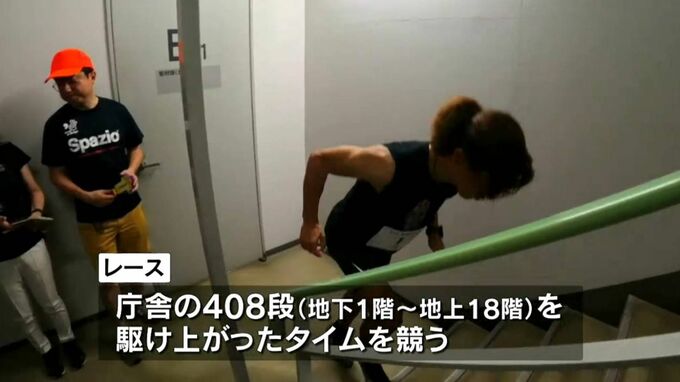14日は48人が参加し、県庁庁舎の地下1階から18階までの408段の階段をダッシュで駆け上がり、タイムを競いました。