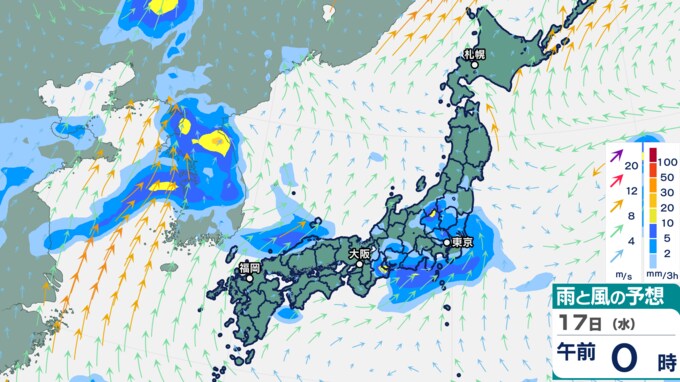 16日(火)夜から17日朝にかけての雨シミュレーションでは、近畿、東海、関東などに発達した雨雲がかかる予想です。