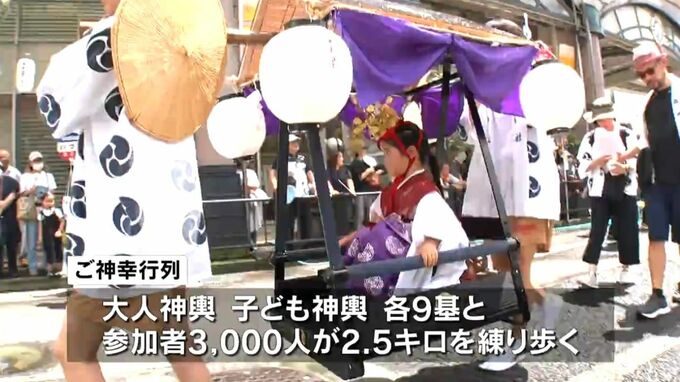 歩行者天国となった天文館の電車通りでは、ご神幸行列で大人神輿と子ども神輿のそれぞれ9基と参加者3000人がおよそ2.5キロを練り歩きました。