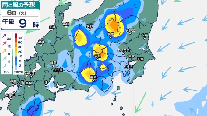 7日(水)雨シミュレーションでは、未明と夕方以降に関東甲信や東海で発達した雨雲が予想されています。