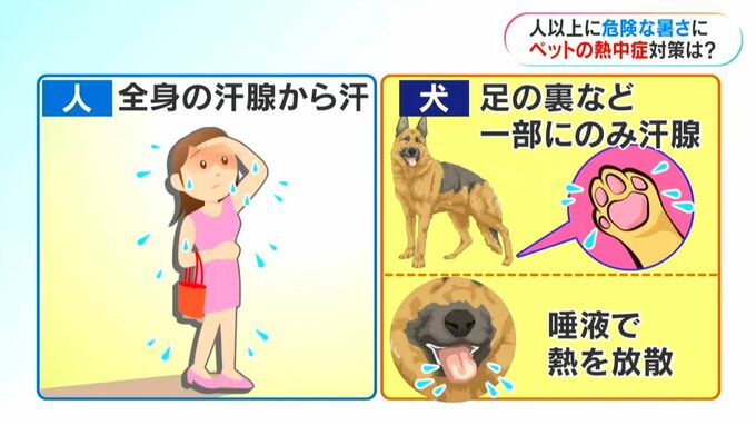 「犬が熱中症になりやすい。呼吸数があがる、触ったときに熱い。ぐったりして吐いたり、意識障害が出たり、心臓に負担が来たり(Q.最悪の場合は?)亡くなる」